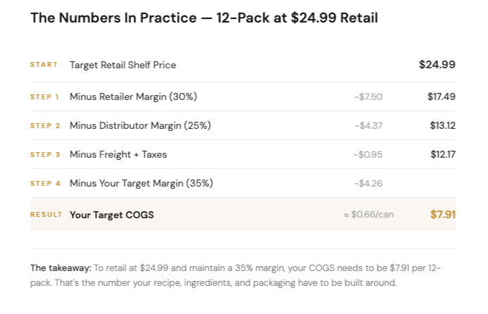 In other words: To sell a 12-pack at $24.99 retail and maintain a 35% margin, your COGS needs to be $7.91 per 12-pack (roughly $0.66 per can). That's the number your recipe, your ingredients, and your packaging have to be built around.